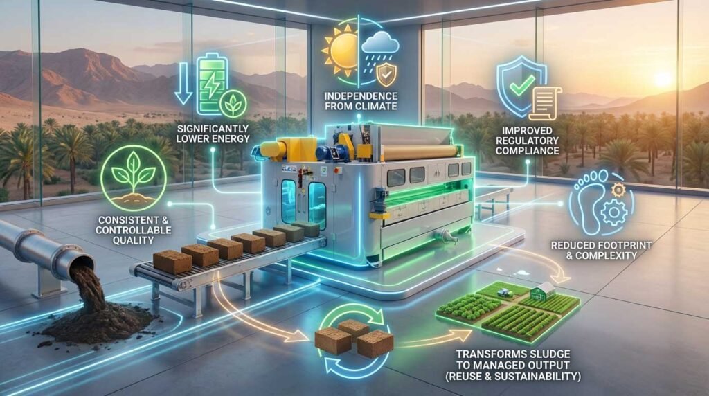 Over the past decade, Oman has made substantial progress in expanding wastewater treatment coverage and treated effluent reuse. However, experience across the region shows that sludge remains the weakest link in otherwise well-designed systems. Conventional approaches such as solar drying beds and thermal drying units often fall short due to inconsistent output quality, high energy consumption, weather dependency, odour issues, and limited compliance with evolving environmental standards.
